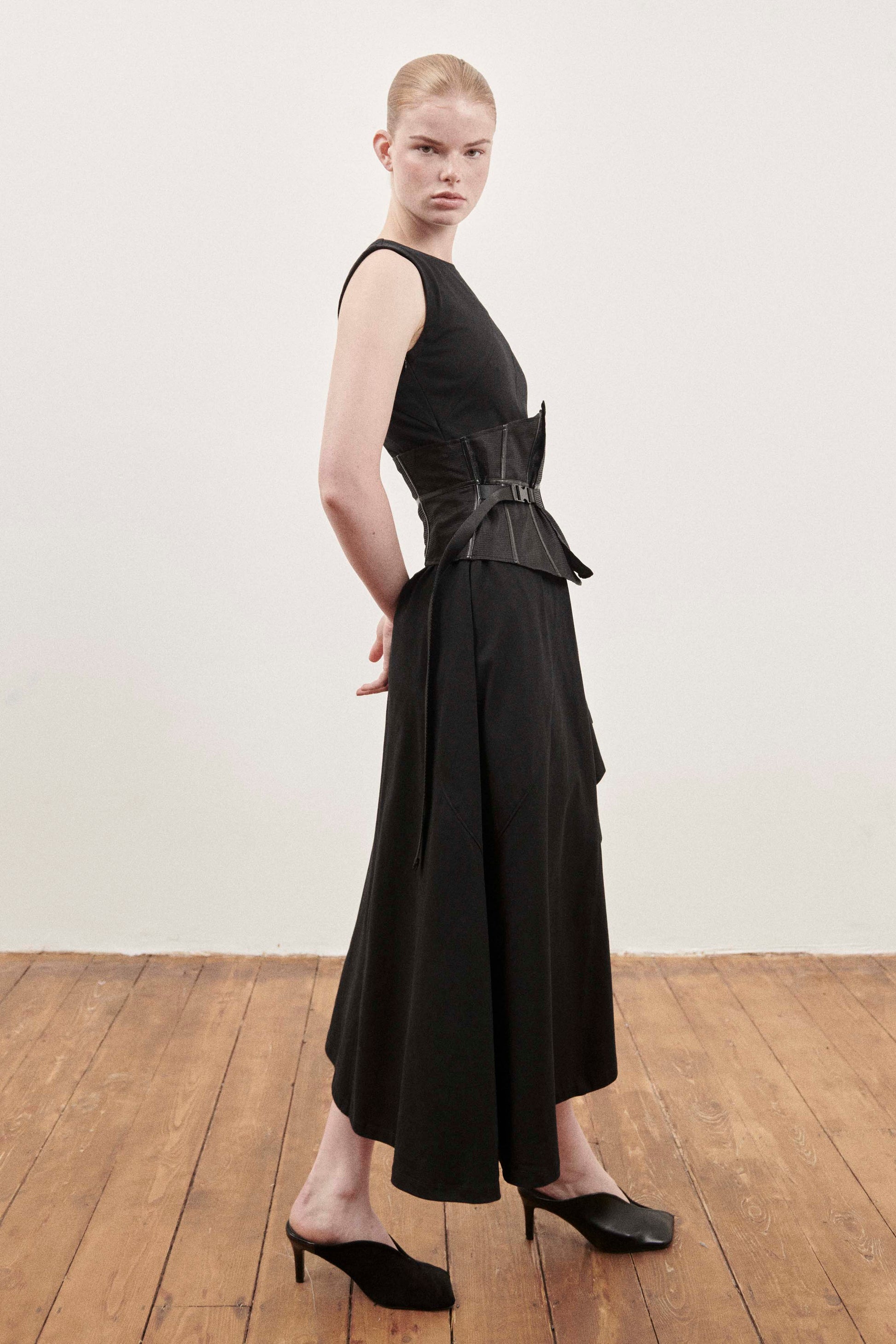 The Snatch Corset Dress uses diagonal darting across the chest for a form fit and a long flowing skirt, combined with a silk buckled corset for an adjustable cinch.