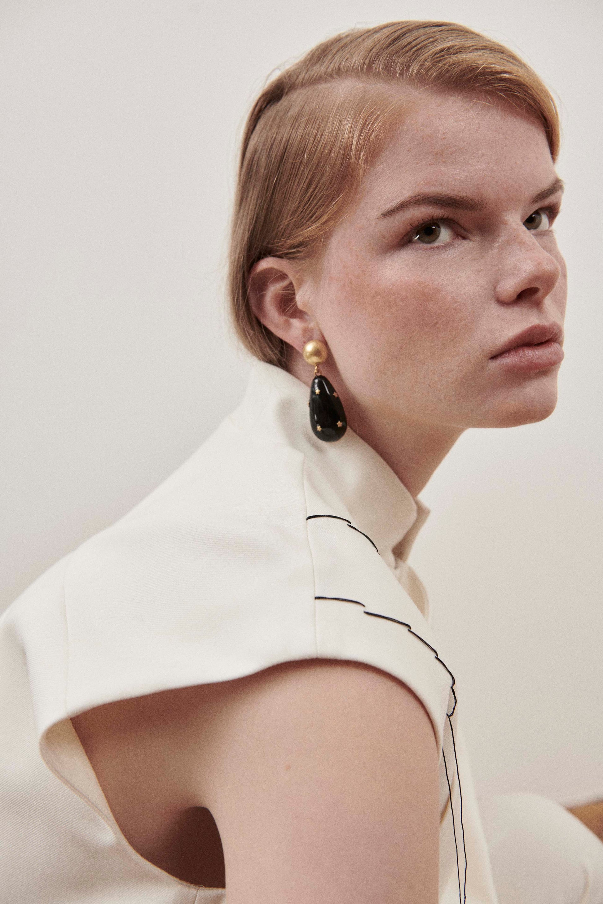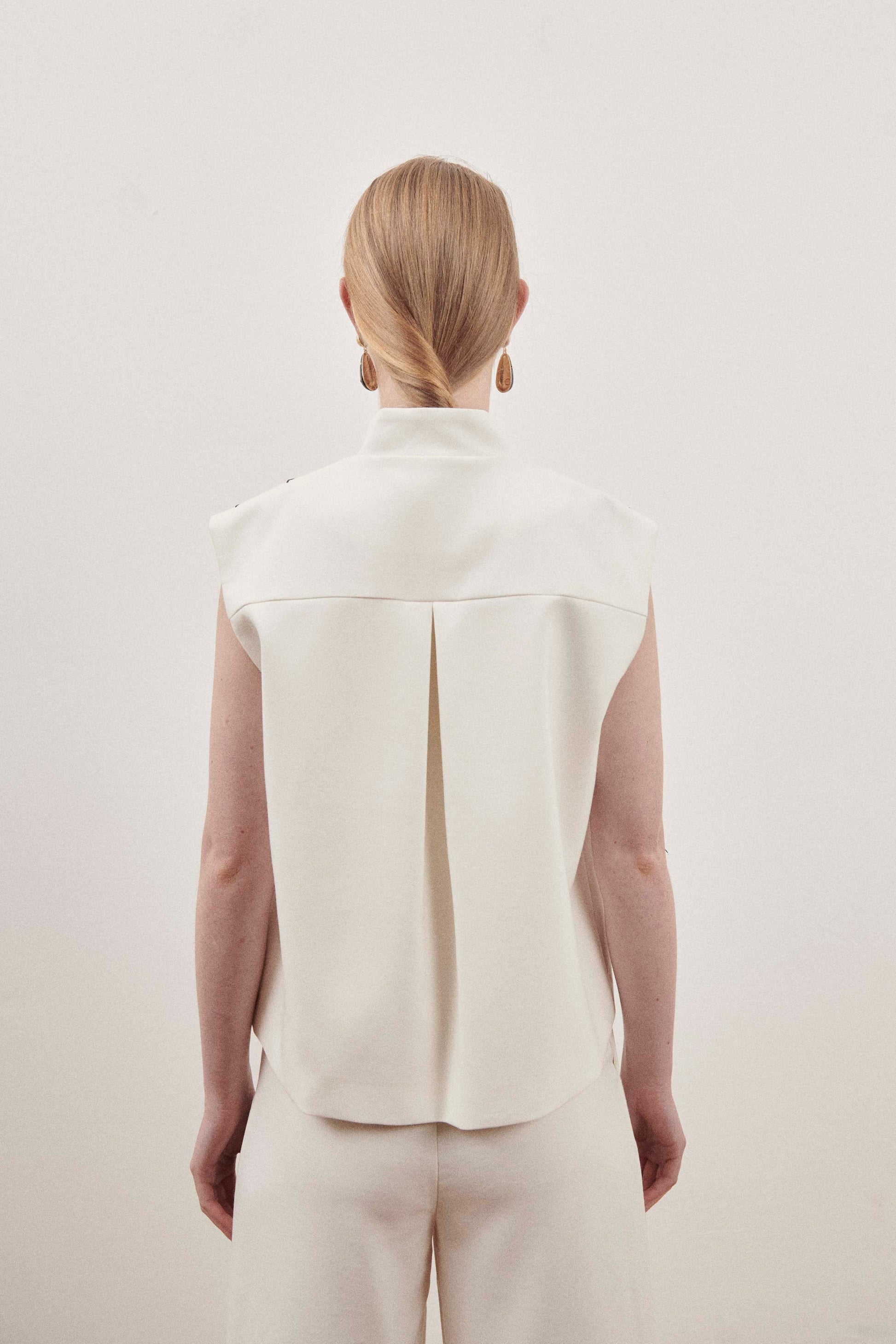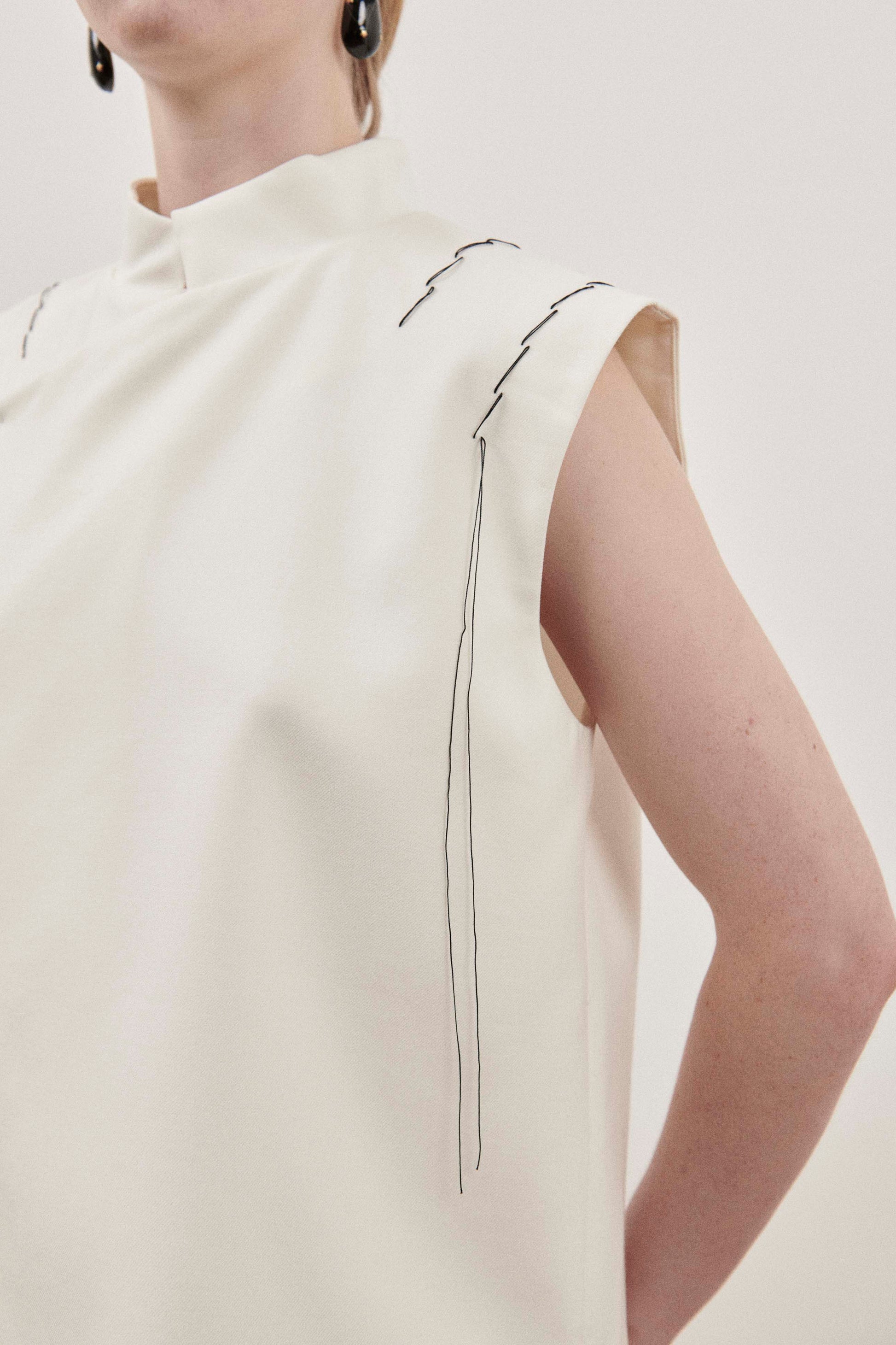 Elegant cream, sleeveless top with contrast stitch detailing across the shoulders, mock neck and back darting.