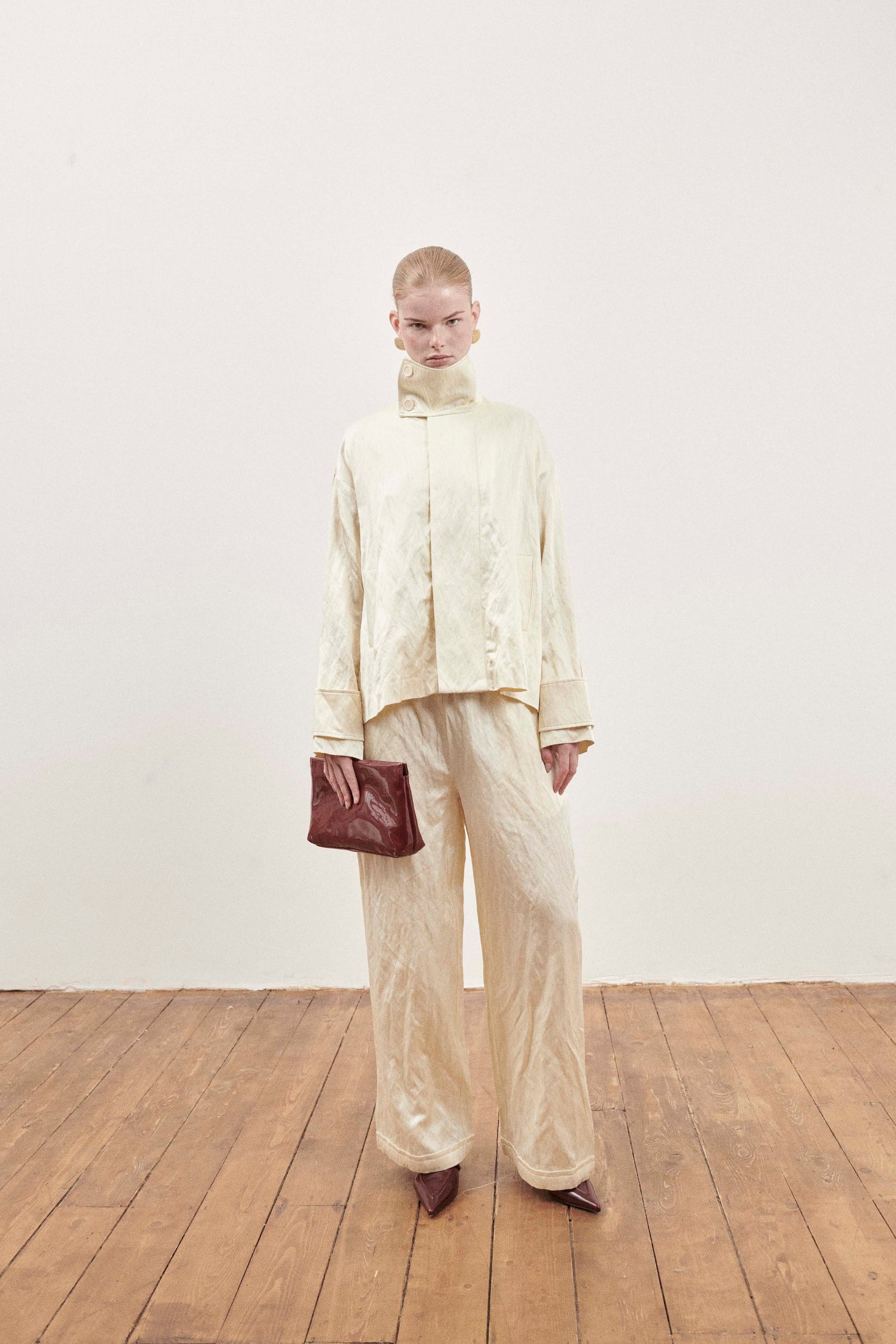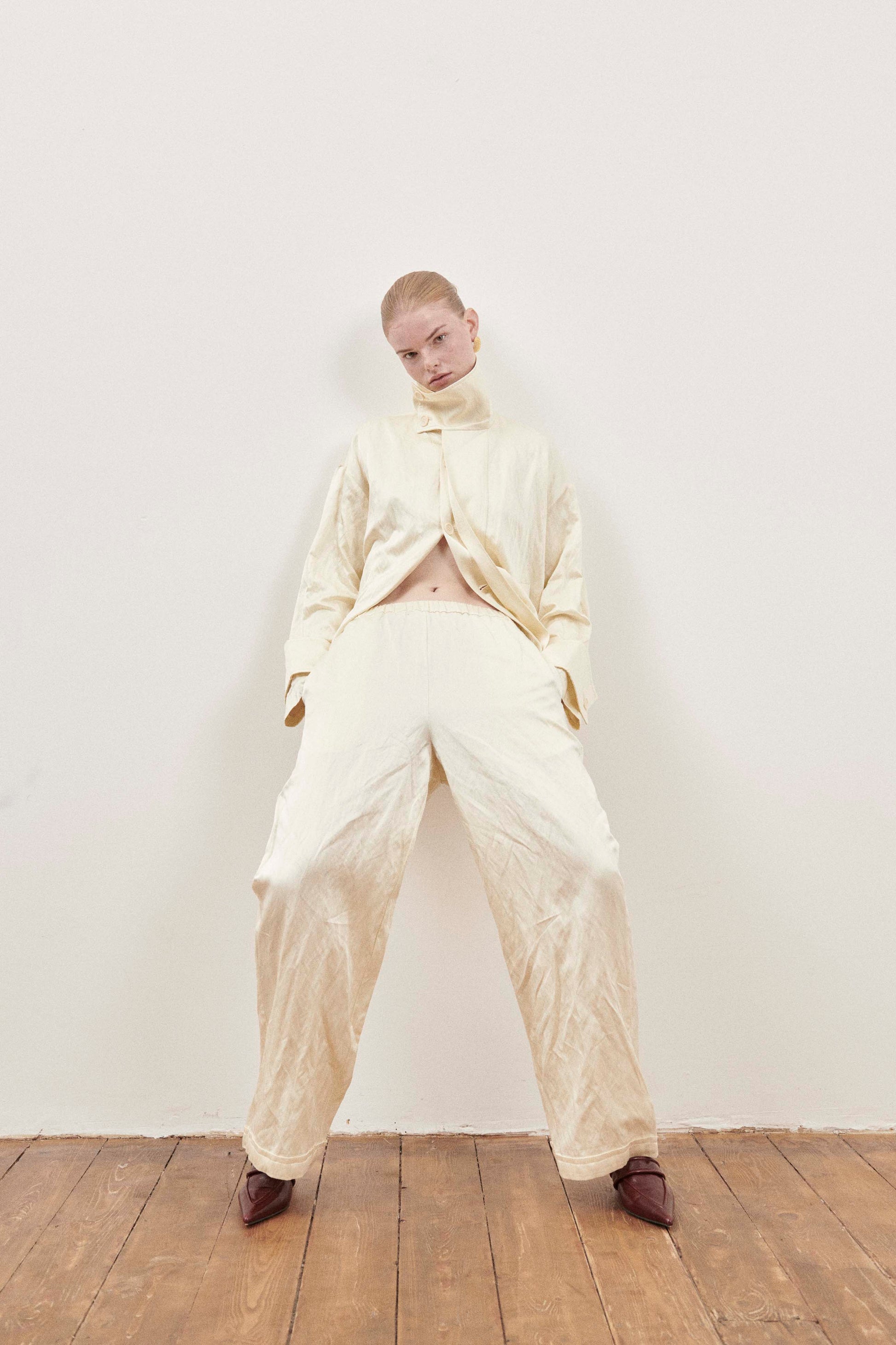 Loose fit, pre-crinkled trousers with an elasticated waistband for added comfort.