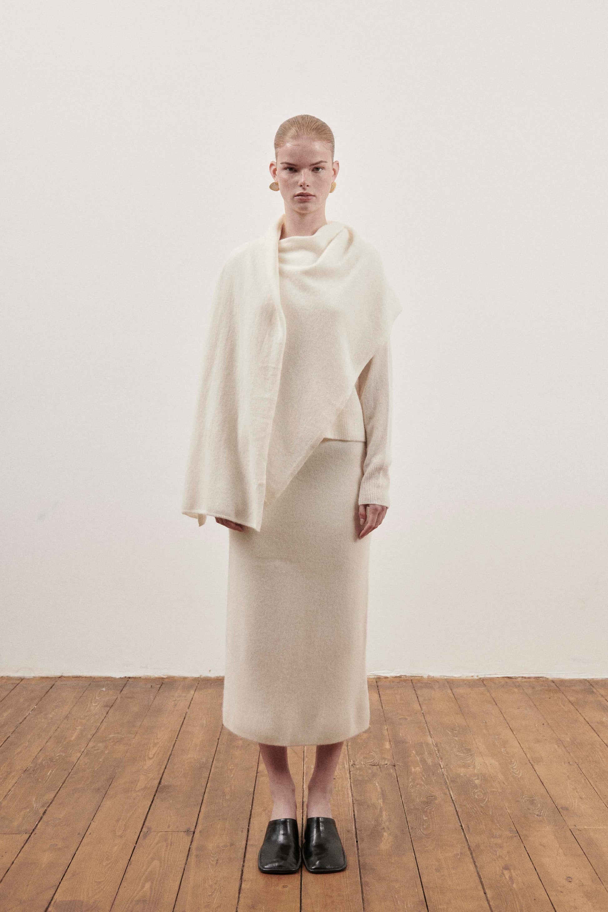 A casual and cosy cashmere skirt with an elasticated waistband and back slit for added comfort.