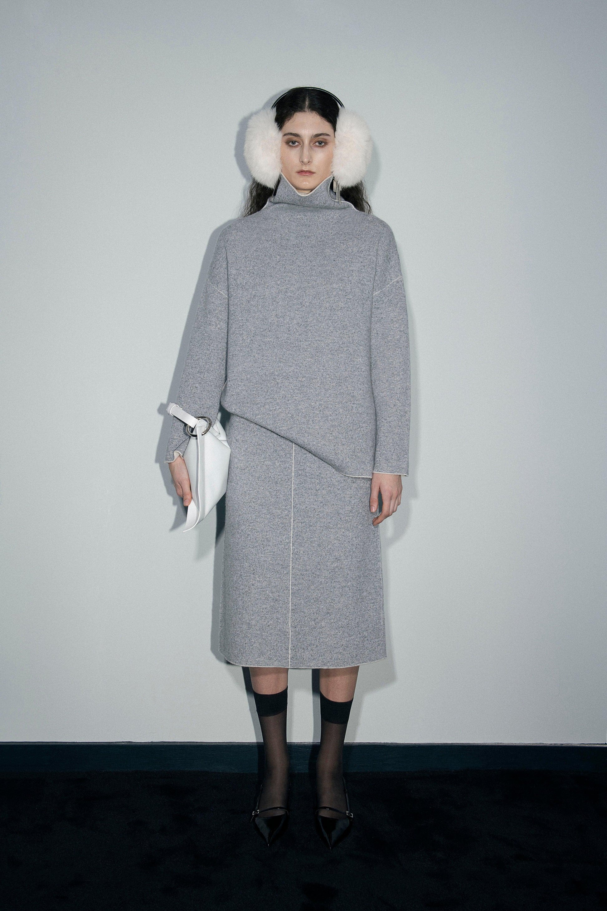 The Jodi set fuses an architectural silhouette and luxurious comfort. The top features an exaggerated mock neck which can be rolled down for a less dramatic look. The skirt hits just below the knee and has a ribbed, elasticated waistband. The set has contrast stitching and lining in beige cashmere.