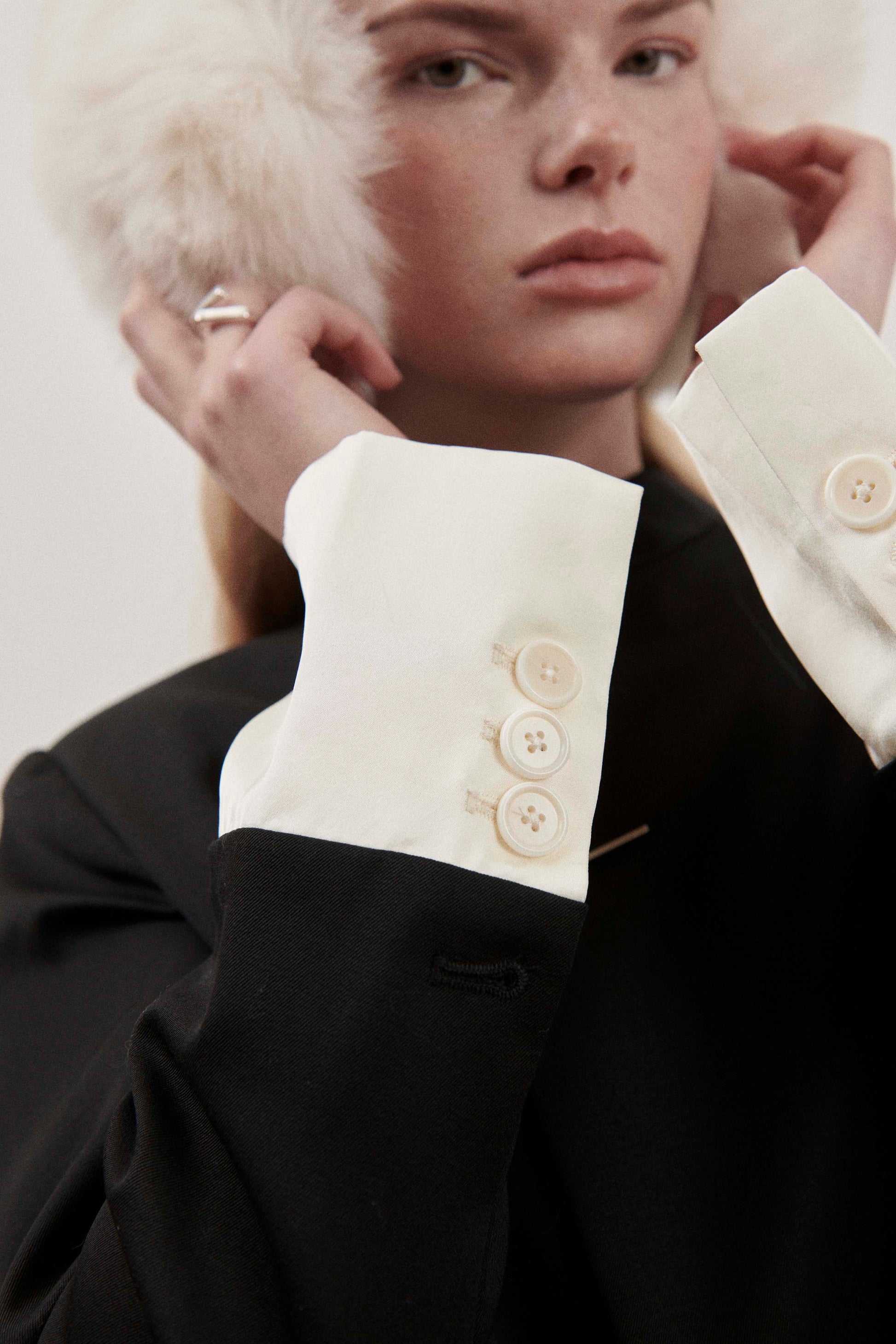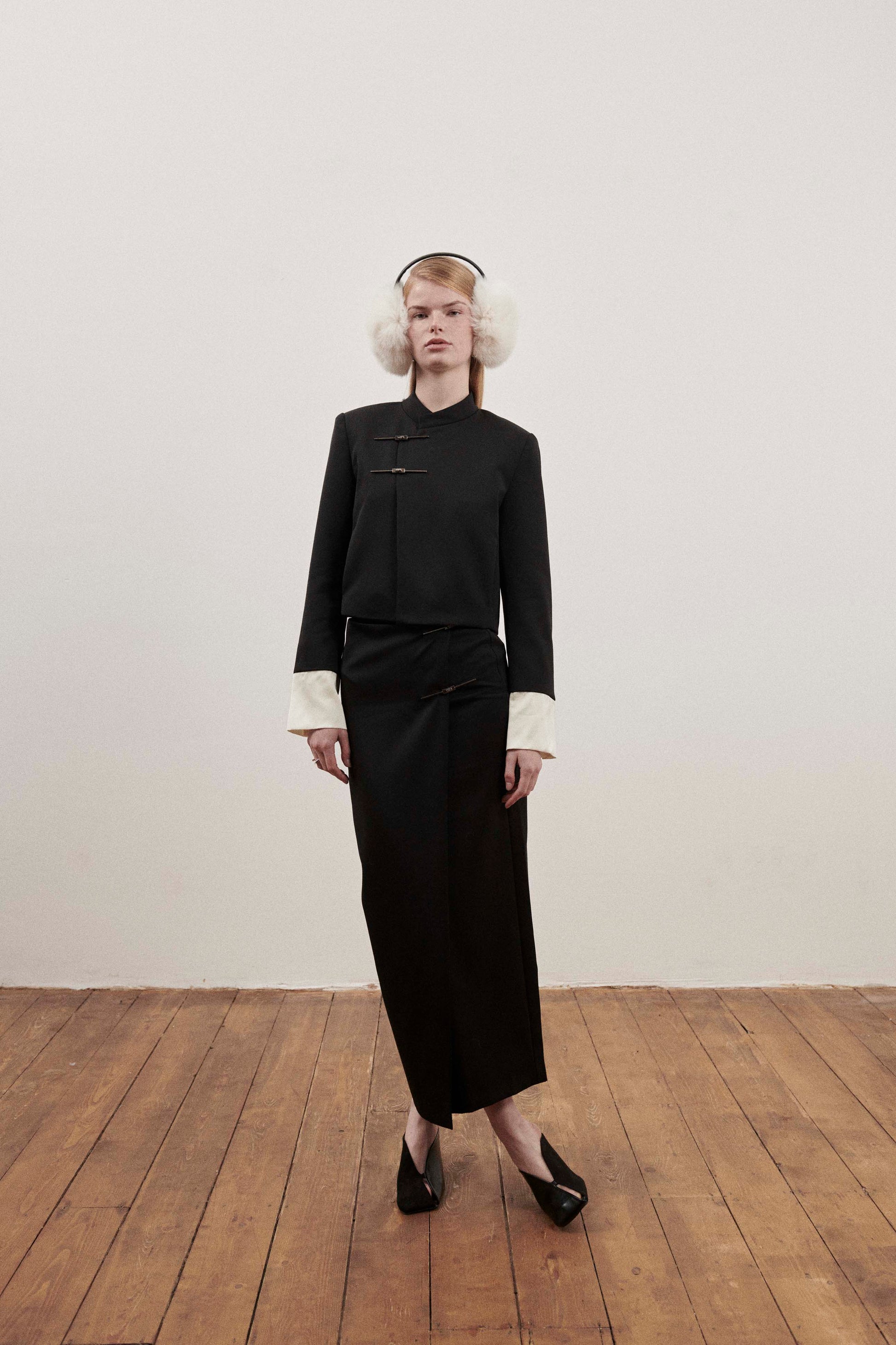 An elevated black crop jacket with a diagonal pin detailing and cream contrast cuffs.
