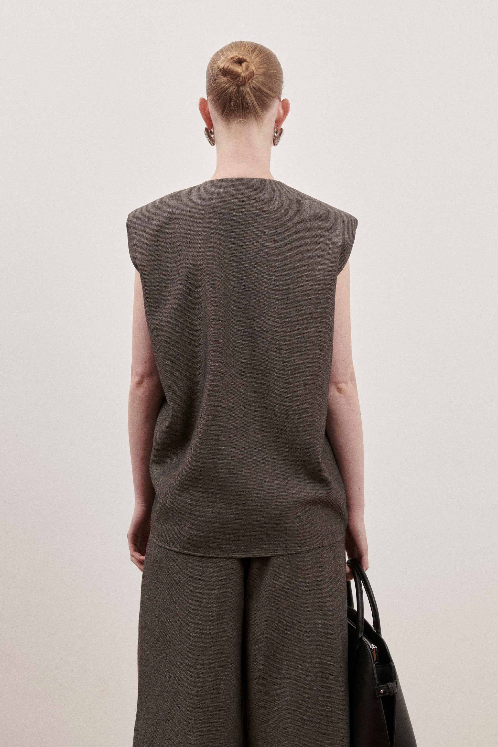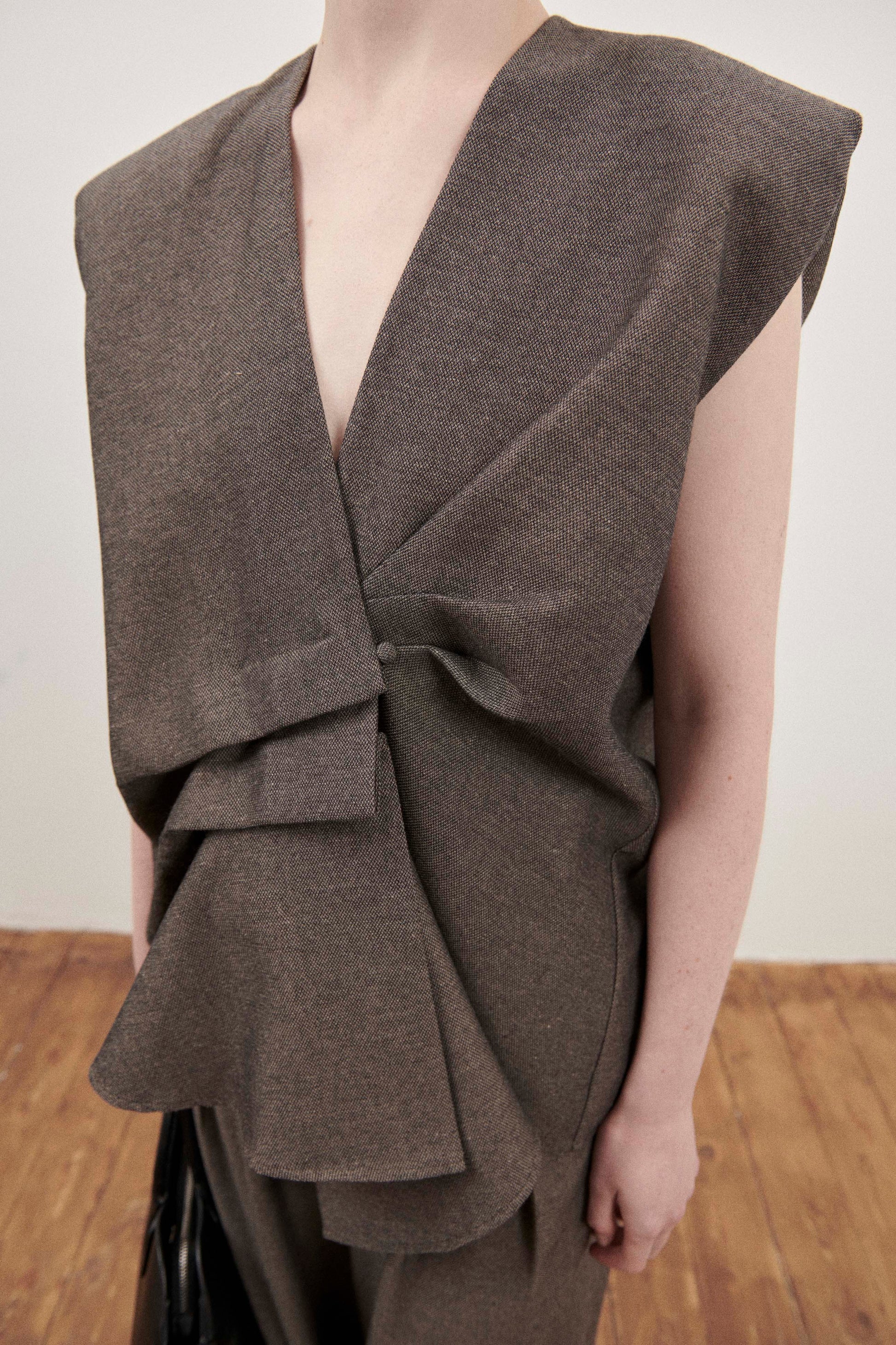 A unique top with multiple folds across the centre, a deep neckline and padded shoulders.