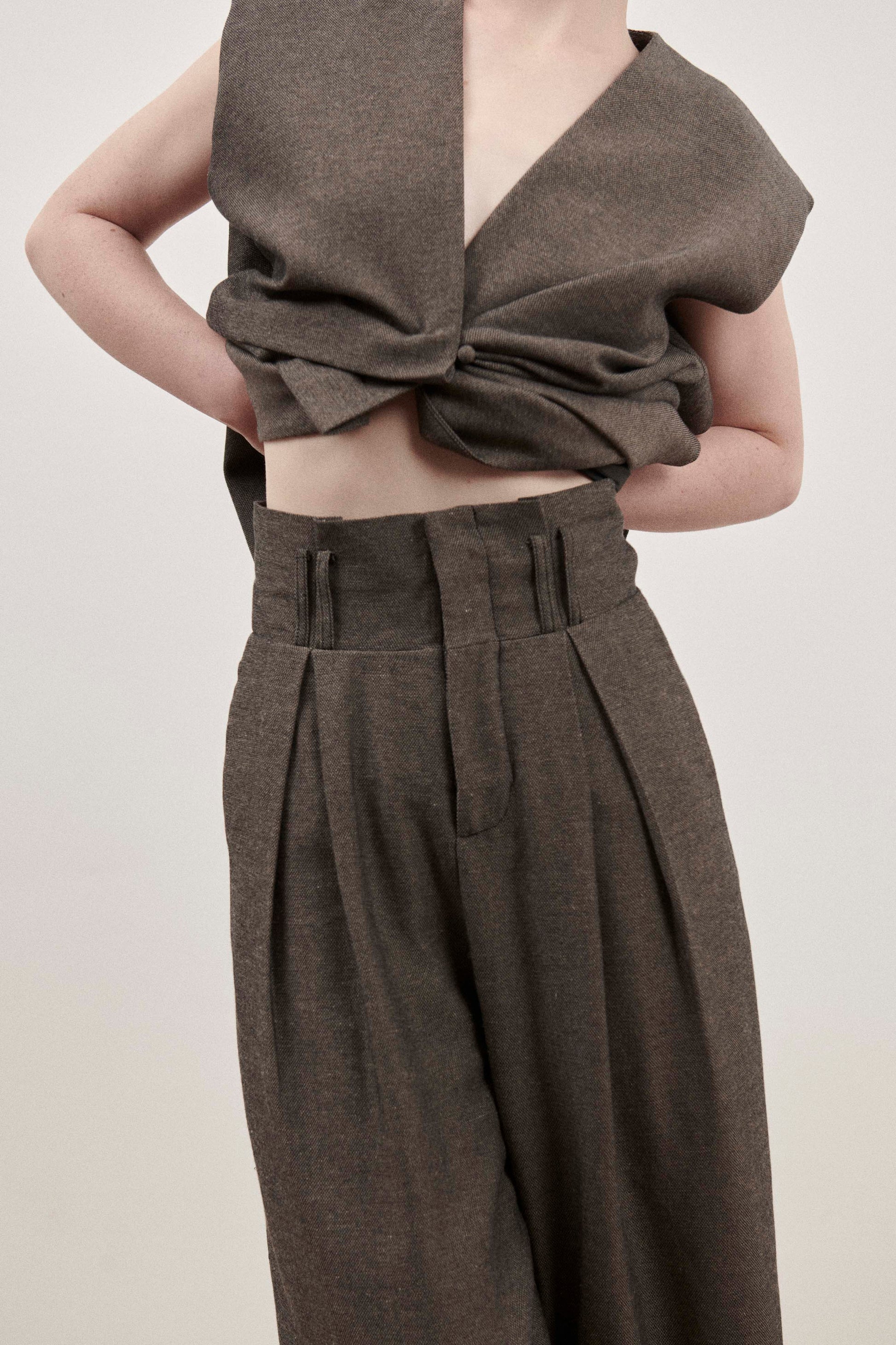 Grey and brown tone blend trousers with heavy darting and a loose, flare fit.