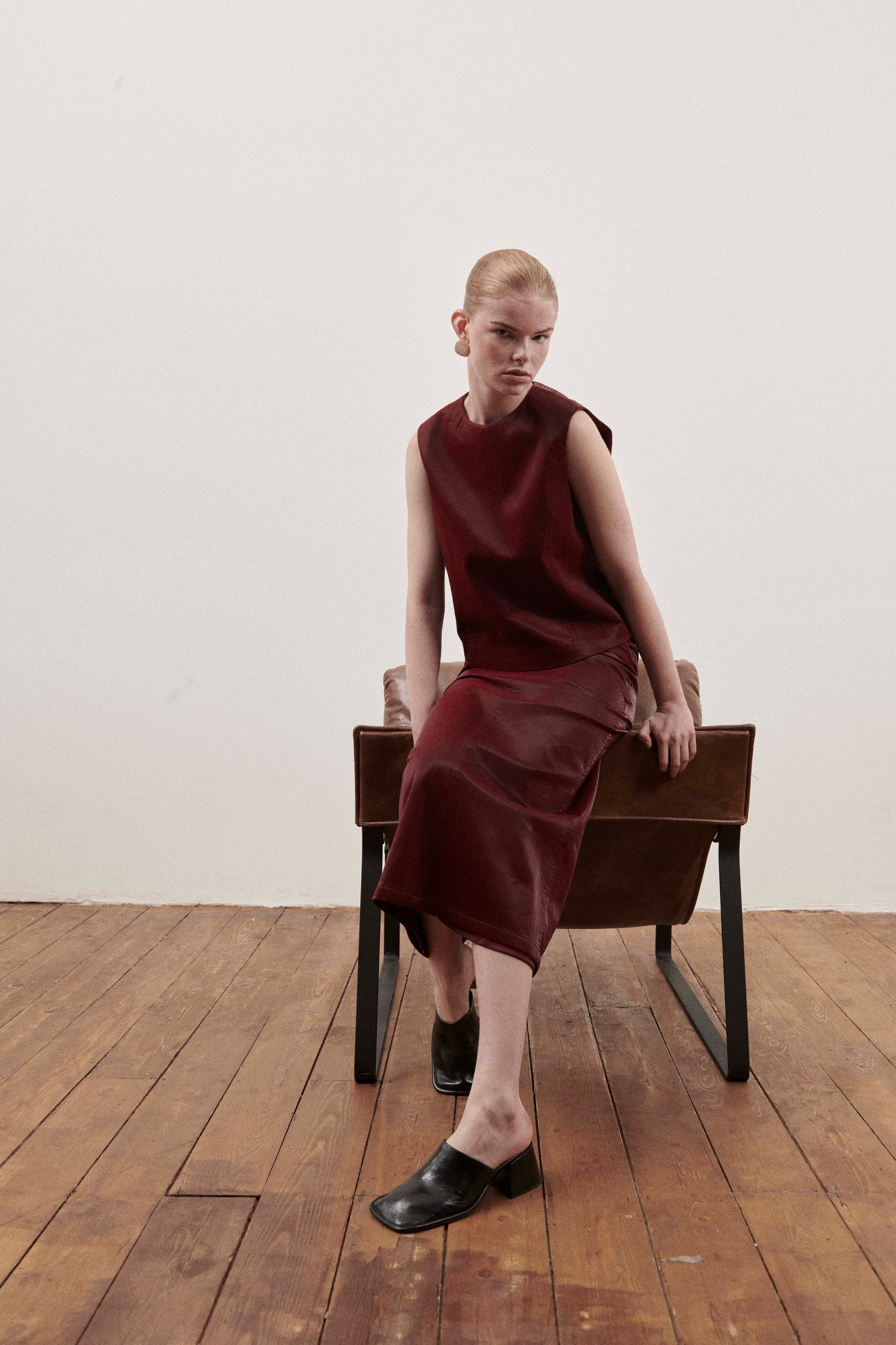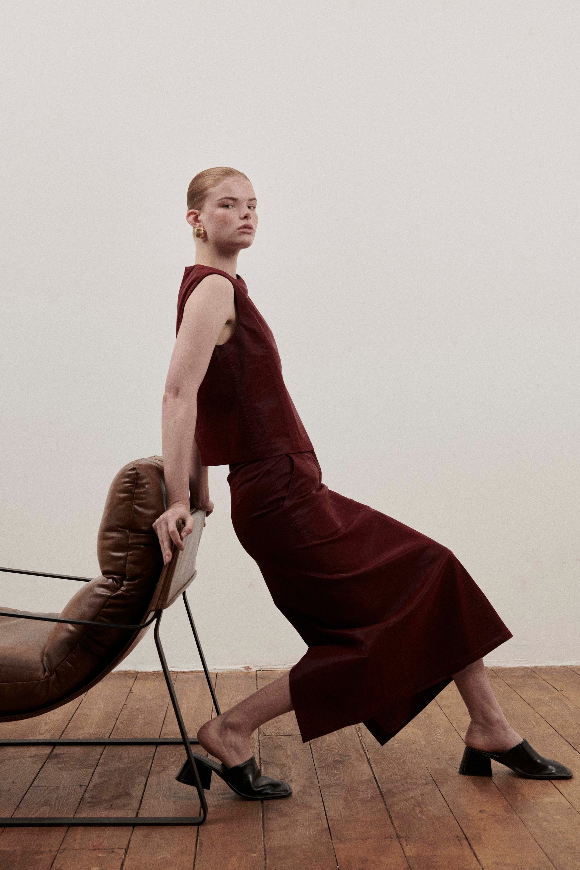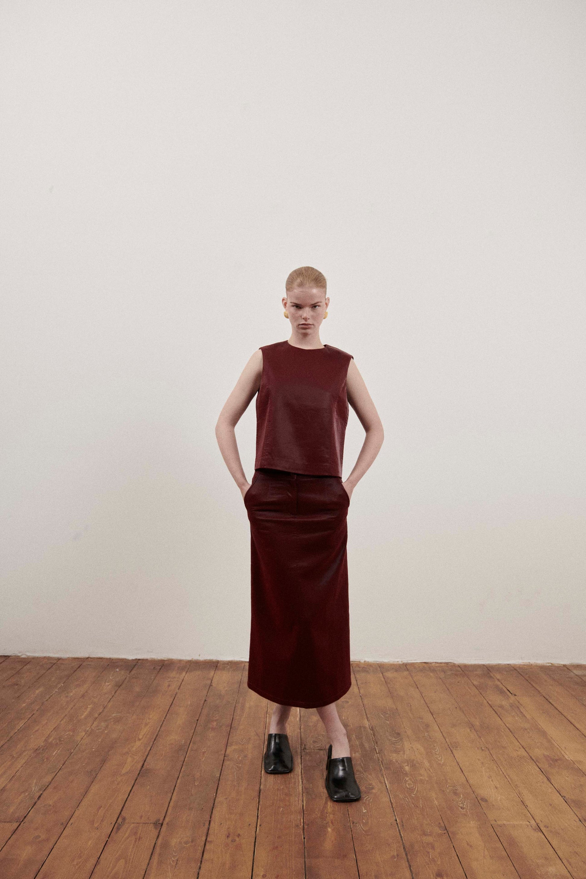 A velvet touch, faux leather maxi skirt with a high rise fit.