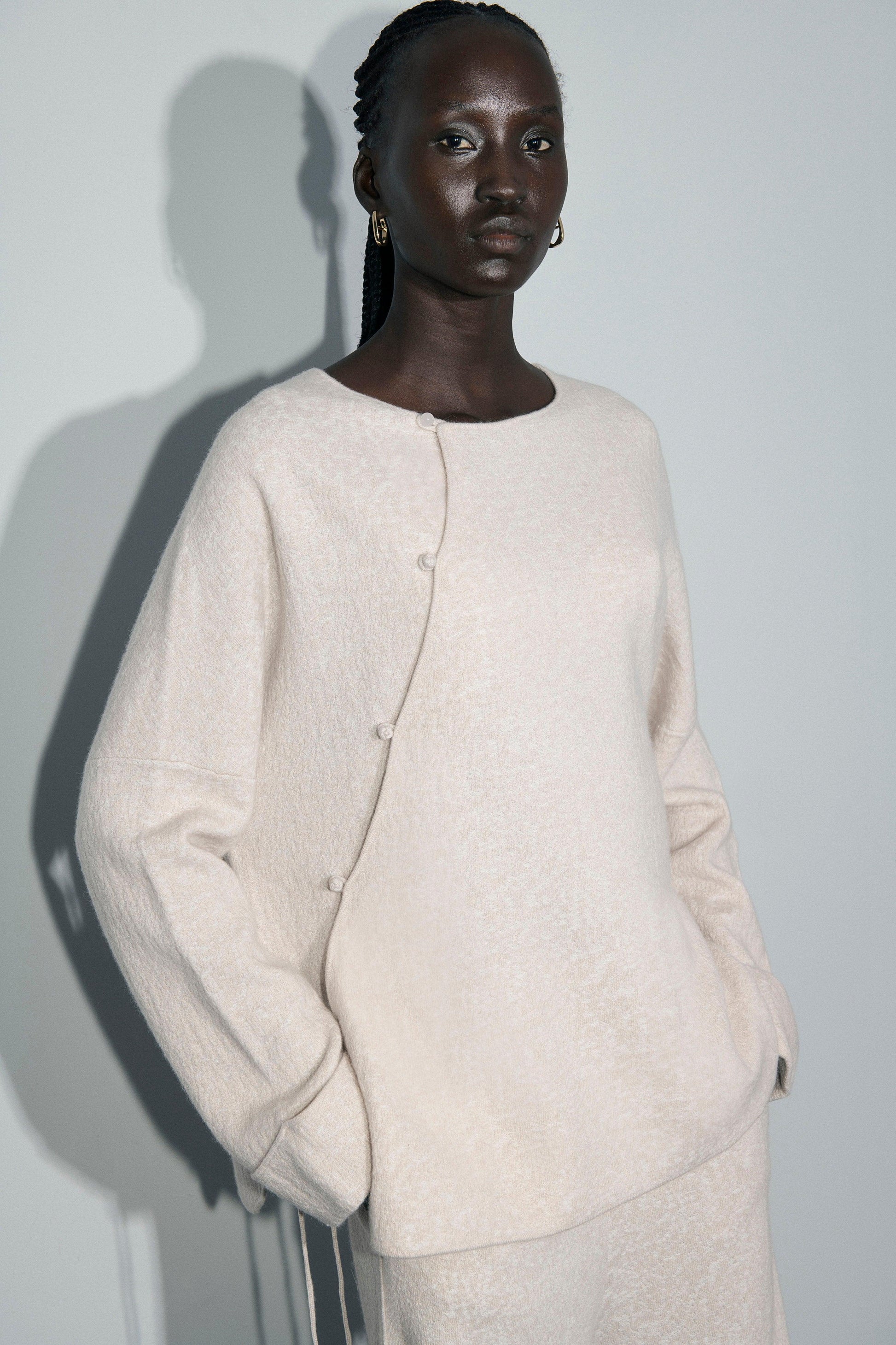 Made from a light cashmere knit, this set seamlessly blends timeless design and ultimate comfort. The top has asymmetric button fastenings, side tie and dropped shoulders for an effortlessly chic but breathable design. An iconic wardrobe staple.