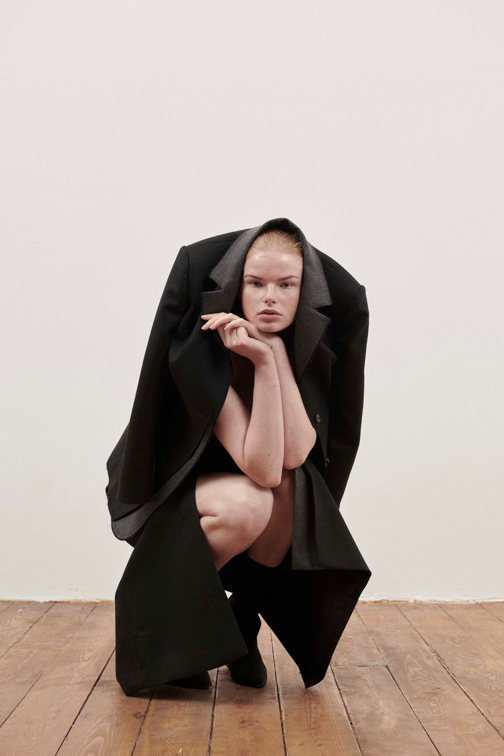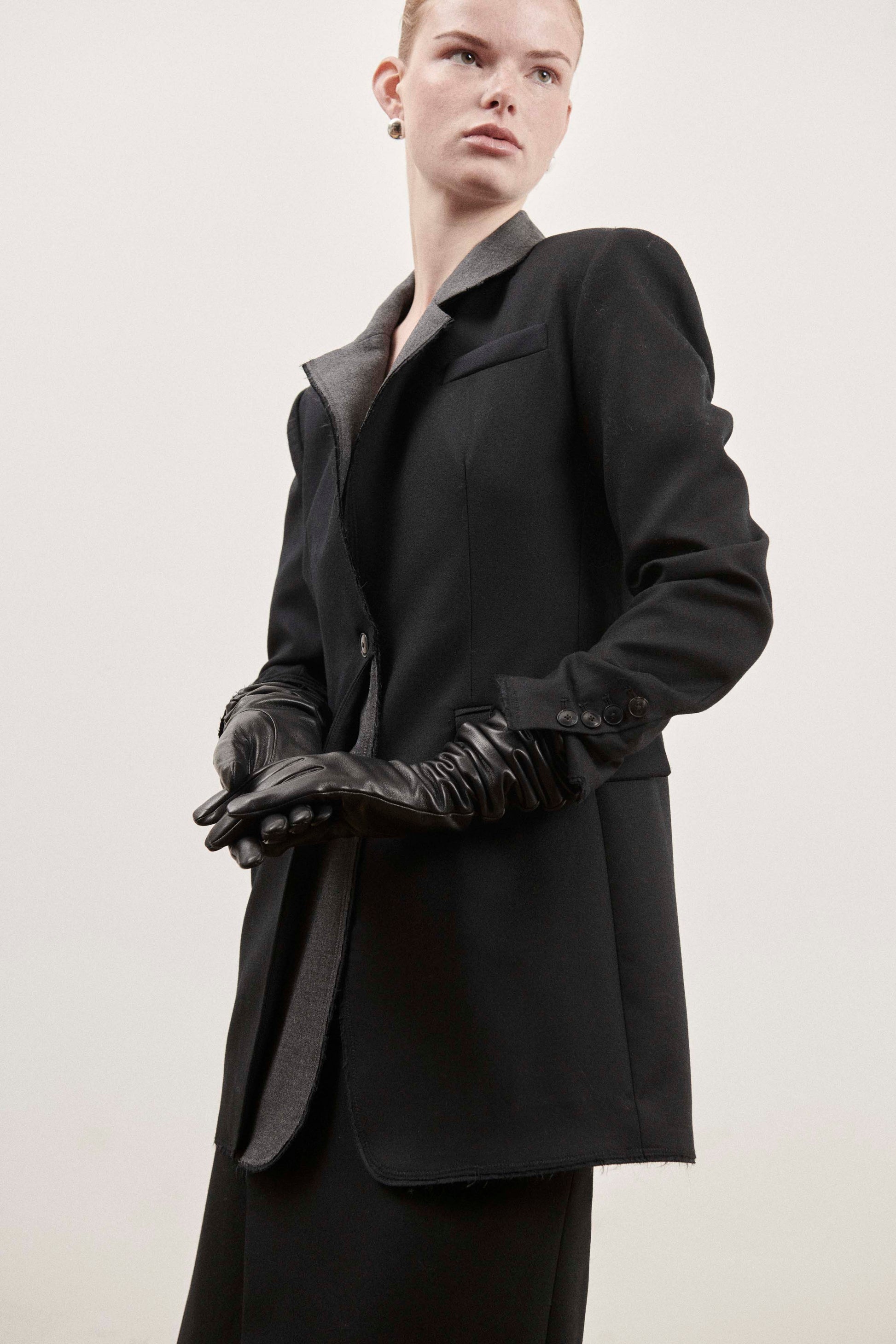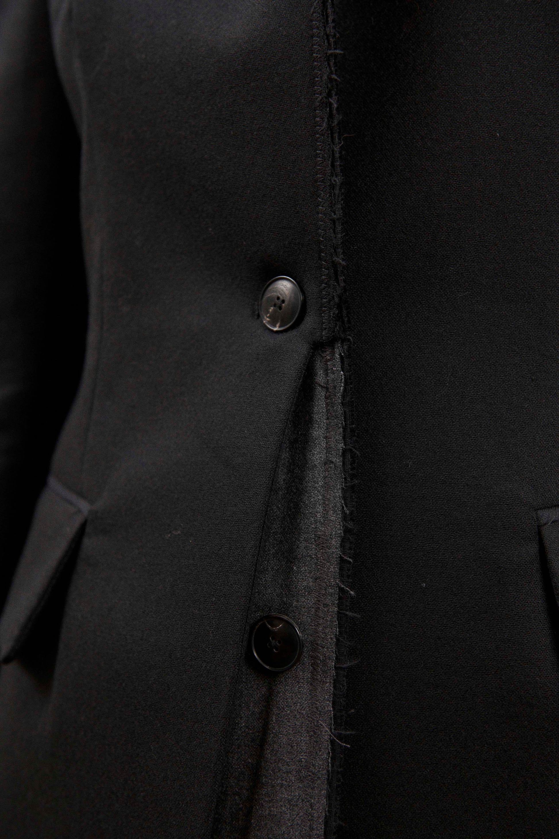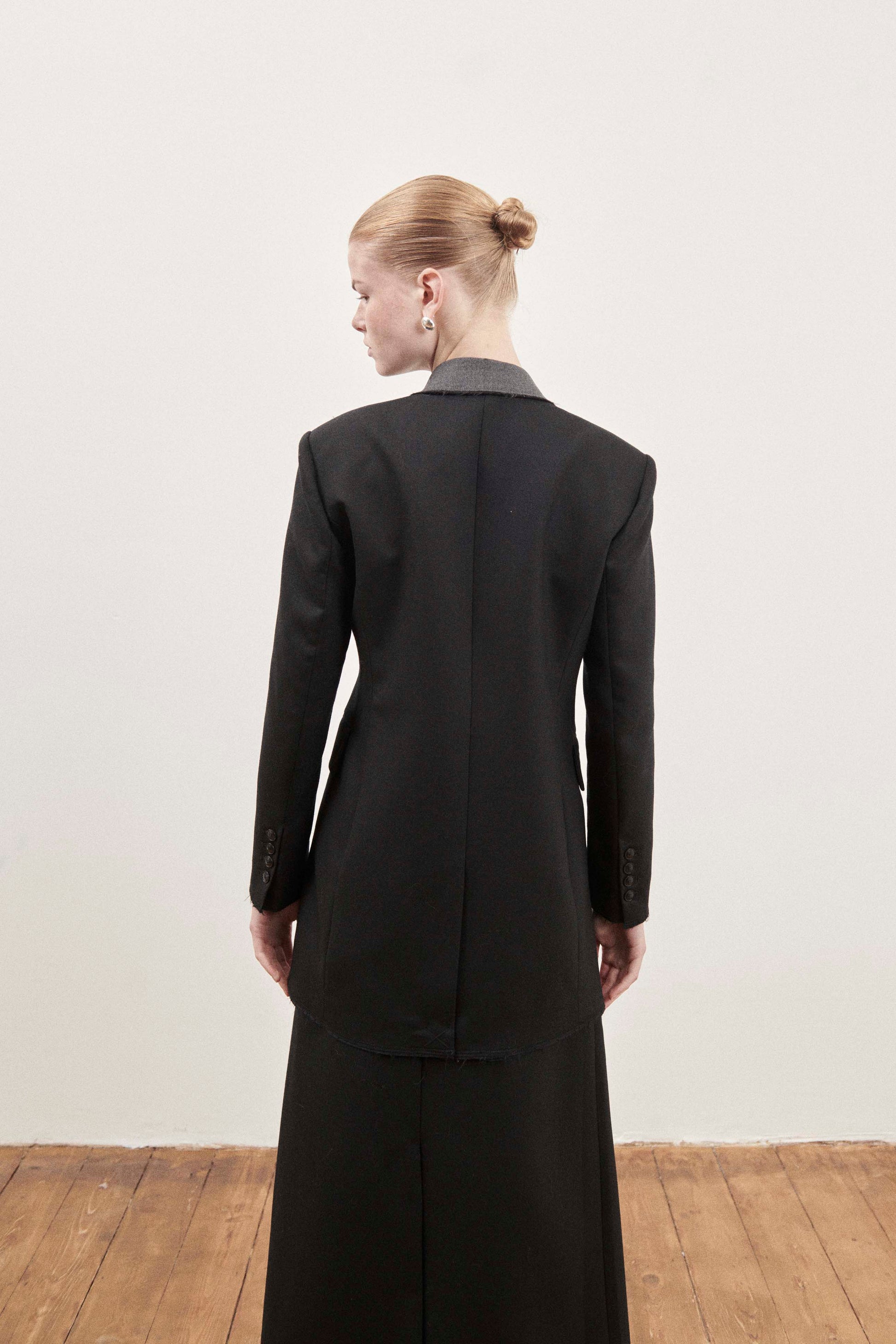 Single breasted, sheep wool blazer with grey accents and raw hem detailing.